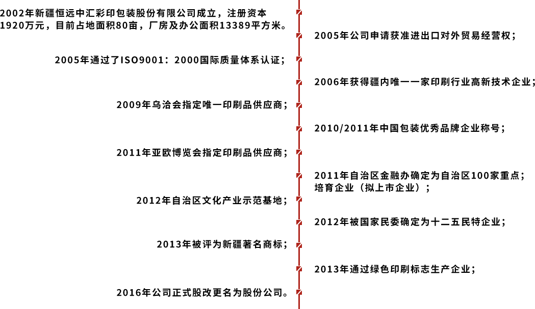 新疆恒遠中匯彩印包裝股份有限公司成立于2002年7月,位于新疆烏魯木齊市高新區(新市區)北工業園區,為客戶提供品牌規劃、設計、印刷、包裝物制作的技術集成公司,整體綜合實力位居新疆包裝行業前列。目前公司占地約80.08畝,已建設完成接近2萬平方米的辦公樓、生產廠房、庫房及宿舍等基本設施。公司依托廣州深厚的印刷包裝技術,引進德國、意大利、瑞士等自動化高效設備幾十臺,工序配置齊全,自主設計研發項目獲得十幾項專利,使企業更具有較強市場競爭力,為優質企業提供品質優良的包裝,讓新疆產品走出新疆,走向國內、國際市場。目前為止公司擁有西北地區的環保水印印刷機,逐步形成擴大了公司的龍頭企業的區域范圍。2017年積極響應國家產業援疆戰略,新設阿克蘇子公司,集合世界先進的包裝技術,服務南疆特色林果業,輻射南疆(和田、喀什、庫爾勒等)各區域;